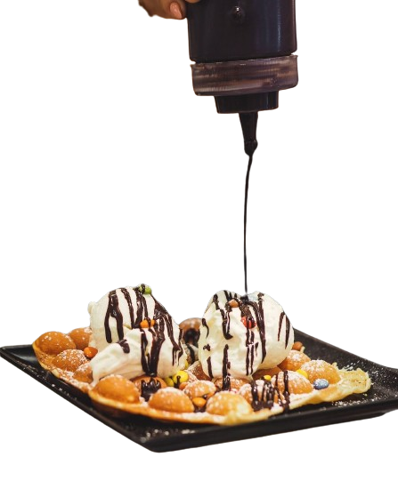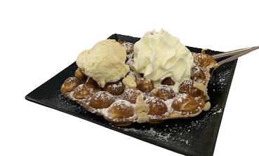 Knusprige Bubble Waffel, gefüllt mit schokoladigem Eis, zarten Schokoladenstückchen und einem Schokoladenüberzug.