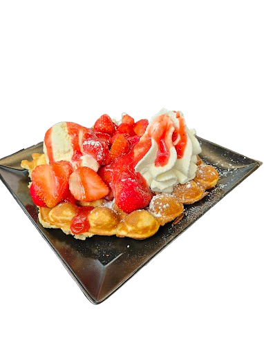 Knusprige Bubble Waffel, gefüllt mit cremigem Erdbeereis, frischen Erdbeeren und einem Hauch Sahne