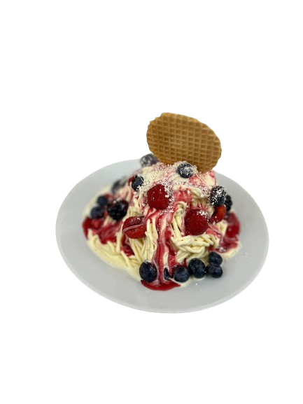 Vanilleeis in Spaghetti-Form, getoppt mit einer wildfruchtigen Mischung aus Waldbeeren – ein fruchtig-frischer Genuss.