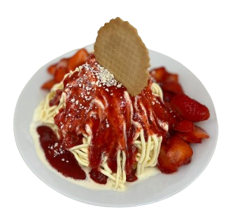 Vanilleeis in Spaghetti-Form, überzogen mit fruchtiger Erdbeersauce und fein geraspelter weißer Schokolade – ein spaßiger Klassiker.